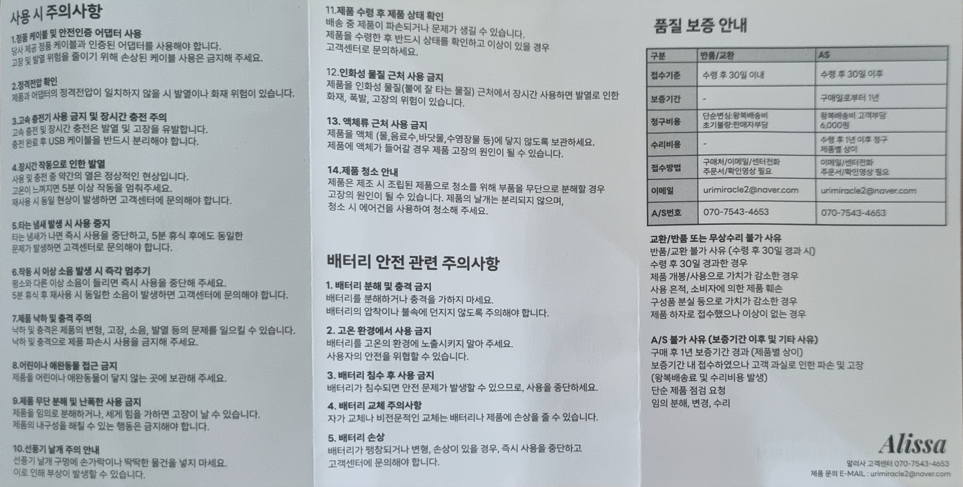 - A/S 및 제품문의 : 알리사고객센터 070-7543-4653
