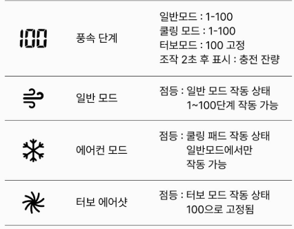 - 일반모드(100단 조절) / 에어컨 모드 13˚c 프리미엄 쿨링 패드 / 터보 모드(15,000rpm 분당 회전수)의 초강력 바람세기